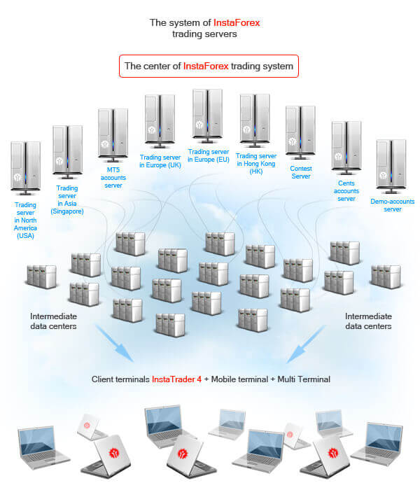 Dimanapun klien baru InstaForex Company berada, Ia dapat memilih satu dari sembilan server trading yang menarik untuk mereka, karena tiap server trading InstaForex adalah alat kendali yang handal yang digunakan untuk mengelola investasi di internet, dan selisih waktu untuk sebuah server dapat mencapai klien di berbagai belahan dunia tidak lebih dari 0.2 detik. Banyak klien yang membuka beberapa akun pada server yang berbeda, sehingga mendapatkan kesempatan untuk memperkirakan kualitas kerja mereka dalam proses trading.